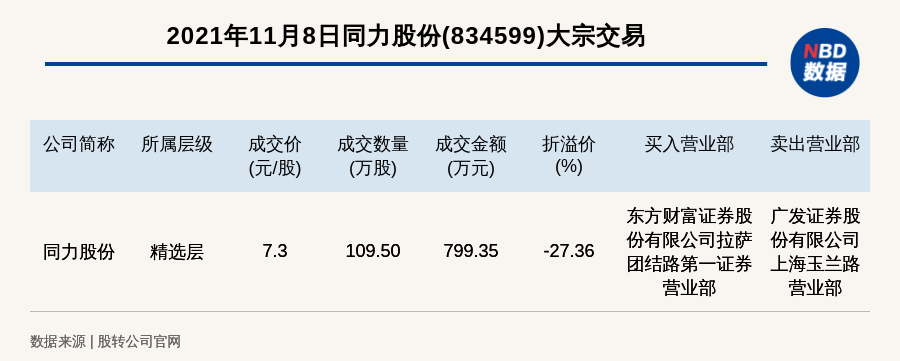 每经讯,2021年11月8日,新三板精选层公司同力股份(834599)发生一笔大宗交易,成交价7.3元/股,成交数量109.50万股,成交金额799.35万元,折价27.36%。买入营业部是东方财富证券股份有限公司拉萨团结路第一证券营业部,卖出营业部是广发证券股份有限公司上海玉兰路营业部。