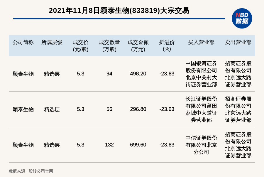 每经讯,2021年11月8日,新三板精选层公司颖泰生物(833819)发生3笔大宗交易,折价率最高的一笔成交价5.3元/股,成交数量94万股,成交金额498.20万元,折价23.63%。买入营业部是中国银河证券股份有限公司北京中关村大街证券营业部,卖出营业部是招商证券股份有限公司北京远大路证券营业部。