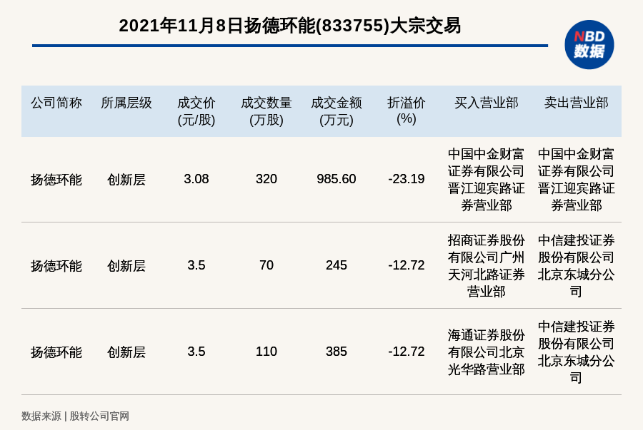 每经讯,2021年11月8日,新三板创新层公司扬德环能(833755)发生3笔大宗交易,总成交金额为1615.60万元,成交金额最高的一笔成交价3.08元/股,成交数量320万股,成交金额985.60万元,折价23.19%。买入营业部是中国中金财富证券有限公司晋江迎宾路证券营业部,卖出营业部是中国中金财富证券有限公司晋江迎宾路证券营业部。