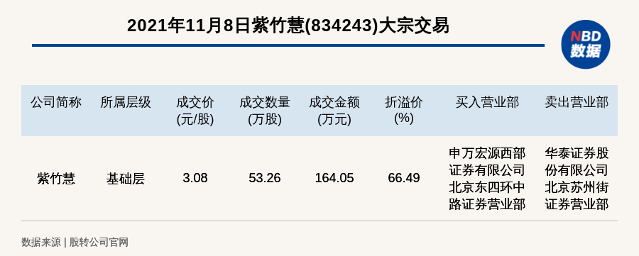 每经讯,2021年11月8日,新三板基础层公司紫竹慧(834243)发生一笔大宗交易,成交价3.08元/股,成交数量53.26万股,成交金额164.05万元,溢价66.49%。买入营业部是申万宏源西部证券有限公司北京东四环中路证券营业部,卖出营业部是华泰证券股份有限公司北京苏州街证券营业部。