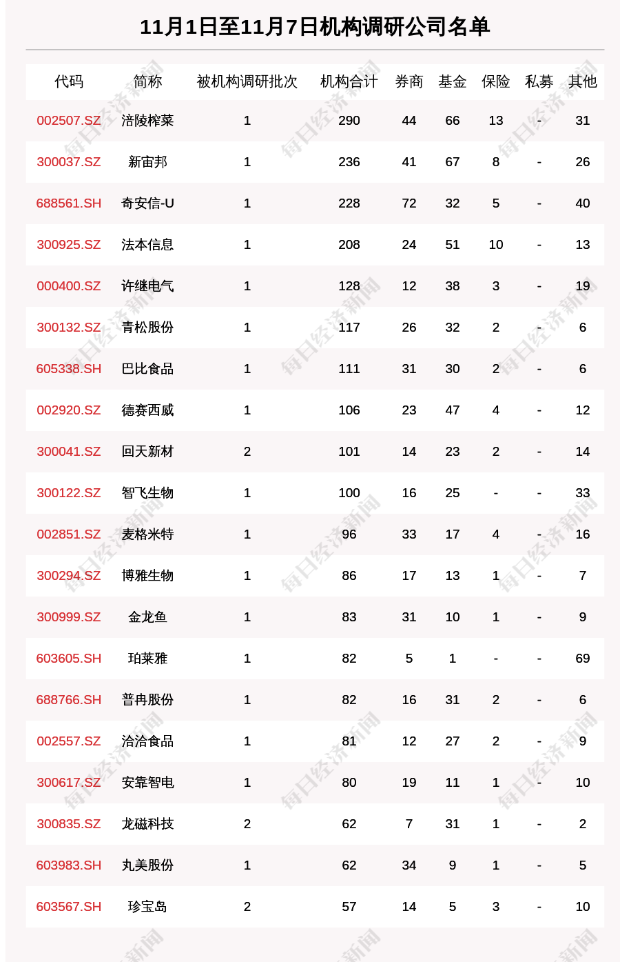 每经AI快讯,11月1日至11月7日,共有212家上市公司接受机构调研,接待机构数量居前的上市公司分别是涪陵榨菜(002507.SZ)、新宙邦(300037.SZ)、奇安信-U(688561.SH),分别有290家、236家、228家机构到上市公司进行调研。