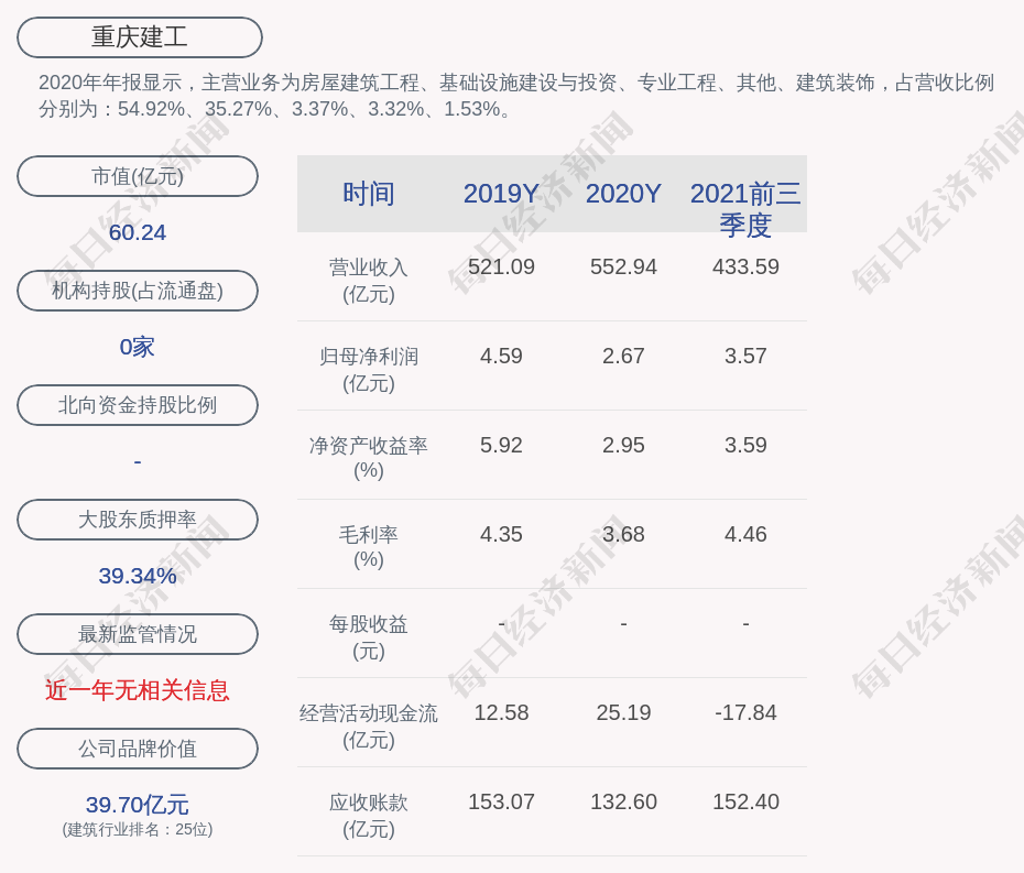 2020年年报显示,重庆建工的主营业务为房屋建筑工程、基础设施建设与投资、专业工程、其他、建筑装饰,占营收比例分别为:54.92%、35.27%、3.37%、3.32%、1.53%。项目名称:仙山里项目(一期、二期、三期)EPC 总承包。建设地点:重庆市武隆区仙女山镇银杏大道 157 号,重庆 市武隆区仙女山镇石梁子社区。