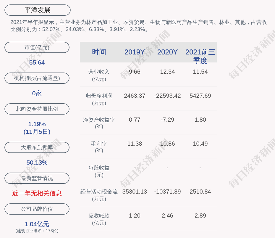 2021年半年报显示,平潭发展的主营业务为林产品加工业、农资贸易、生物与新医药产品生产销售、林业、其他,占营收比例分别为:52.07%、34.03%、6.33%、3.91%、2.23%。