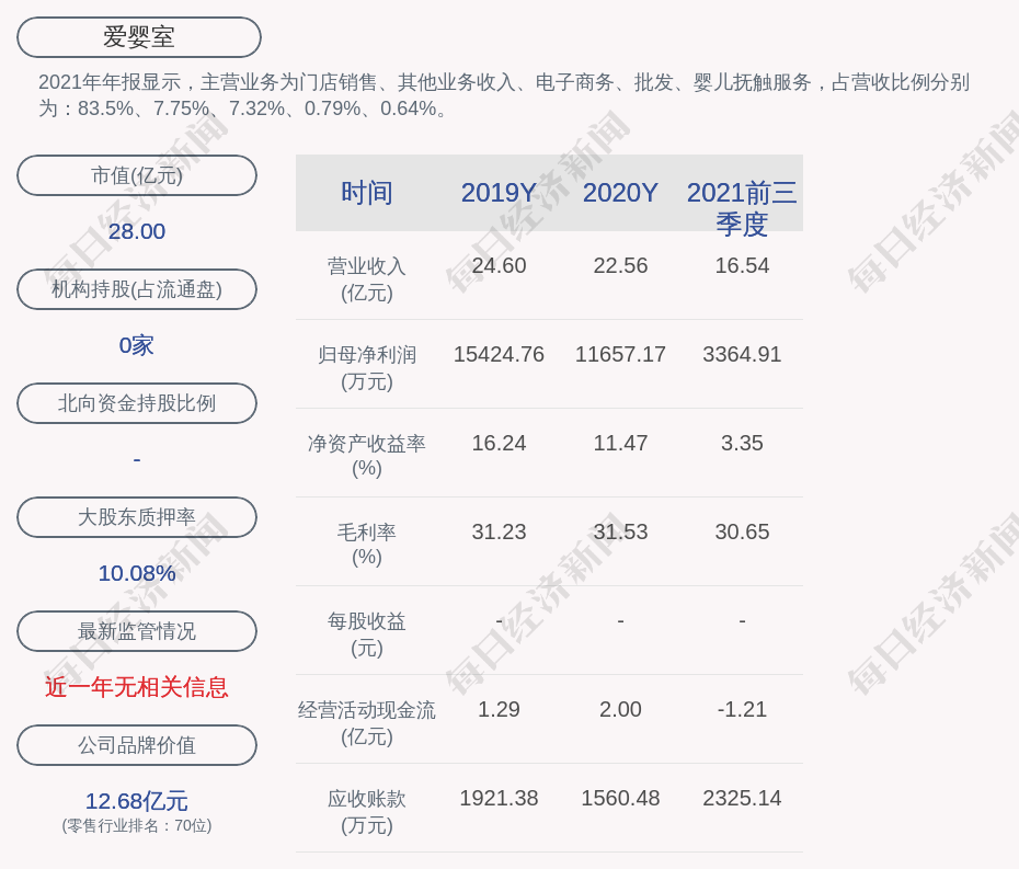 2021年年报显示,爱婴室的主营业务为门店销售、其他业务收入、电子商务、批发、婴儿抚触服务,占营收比例分别为:83.5%、7.75%、7.32%、0.79%、0.64%。