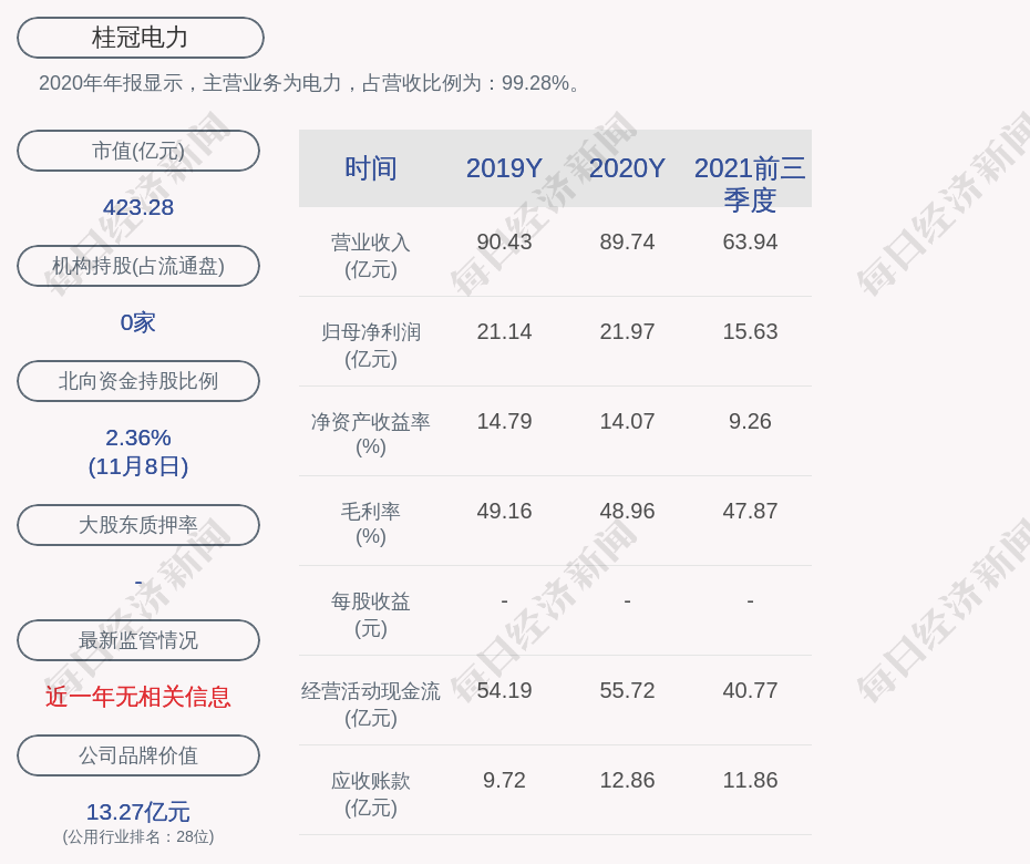 2020年年报显示,桂冠电力的主营业务为电力,占营收比例为:99.28%。