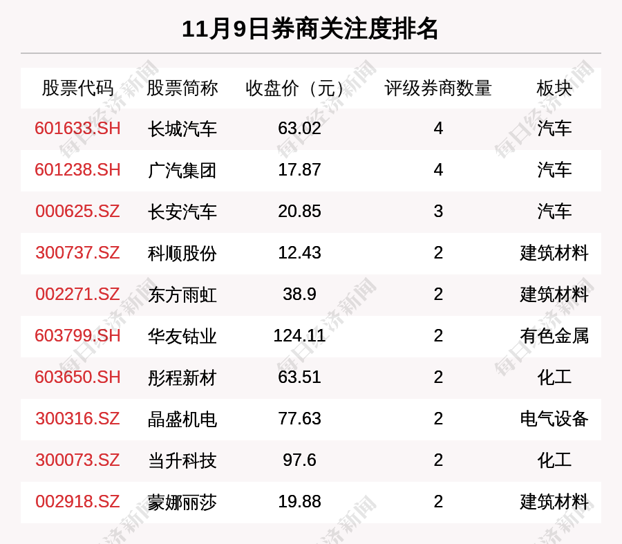 从券商对个股的关注程度来看,有10只个股获得多家券商关注,券商关注数量排名居前的个股是长城汽车(601633.SH)、广汽集团(601238.SH)、长安汽车(000625.SZ)。