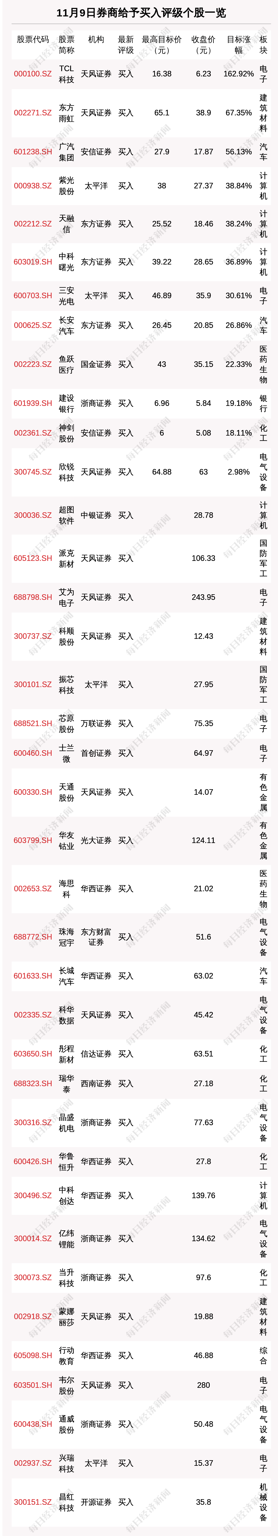 每经AI快讯,11月9日,券商给予评级的个股数共有48只,获得买入评级的个股数共有38只。在公布了目标价格的12只个股中,按照最新收盘价计算,预期涨幅排名居前的个股是TCL科技(000100.SZ)、东方雨虹(002271.SZ)、广汽集团(601238.SH),预期涨幅分别是162.92%、67.35%、56.13%。