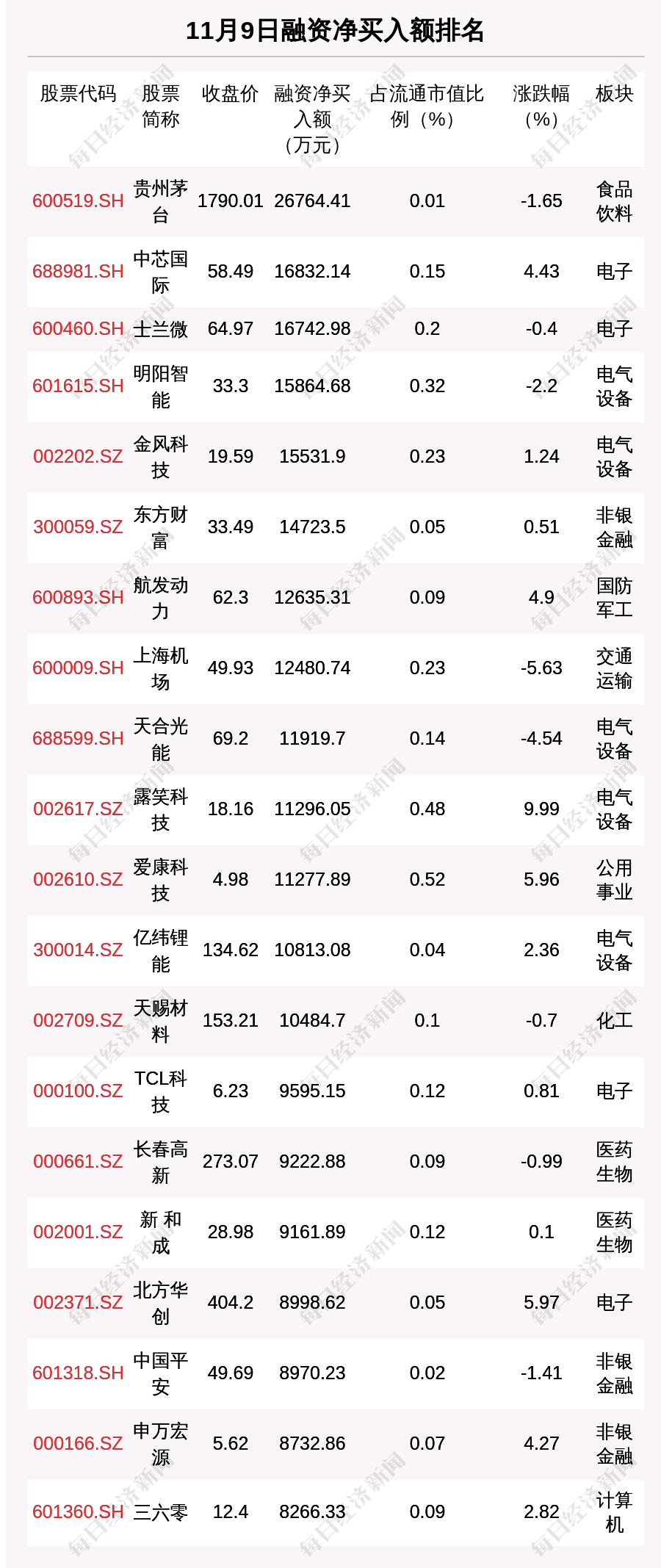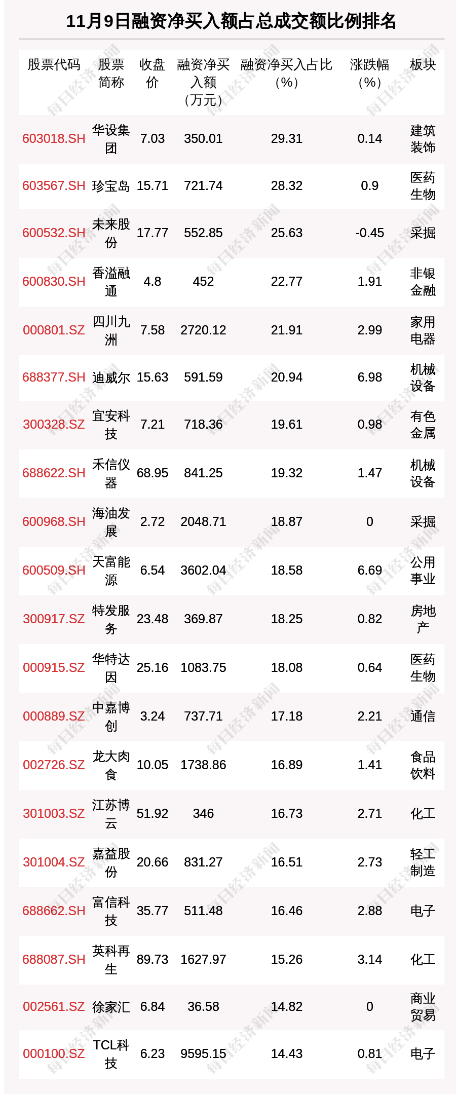 11月9日两市共有1136只个股有融资资金净买入。共有52只股票融资净买入额占总成交金额比例超10%,其中华设集团、珍宝岛、未来股份排名前三,占比分别为29.31%、28.32%、25.63%。