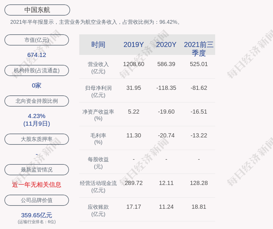2021年半年报显示,中国东航的主营业务为航空业务收入,占营收比例为:96.42%。