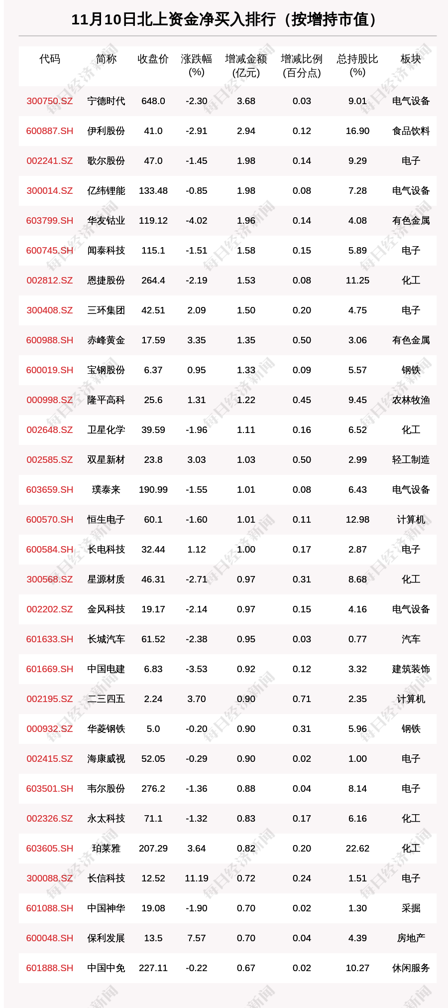 11月10日,按照北向资金增持市值排序,宁德时代(300750.SZ,收盘价:648.0元)增持市值最大,增持市值3.681亿元,环比增加0.30%。其他北上资金增持市值较多的个股还包括伊利股份(600887.SH,收盘价:41.0元)、歌尔股份(002241.SZ,收盘价:47.0元)、亿纬锂能(300014.SZ,收盘价:133.48元)。