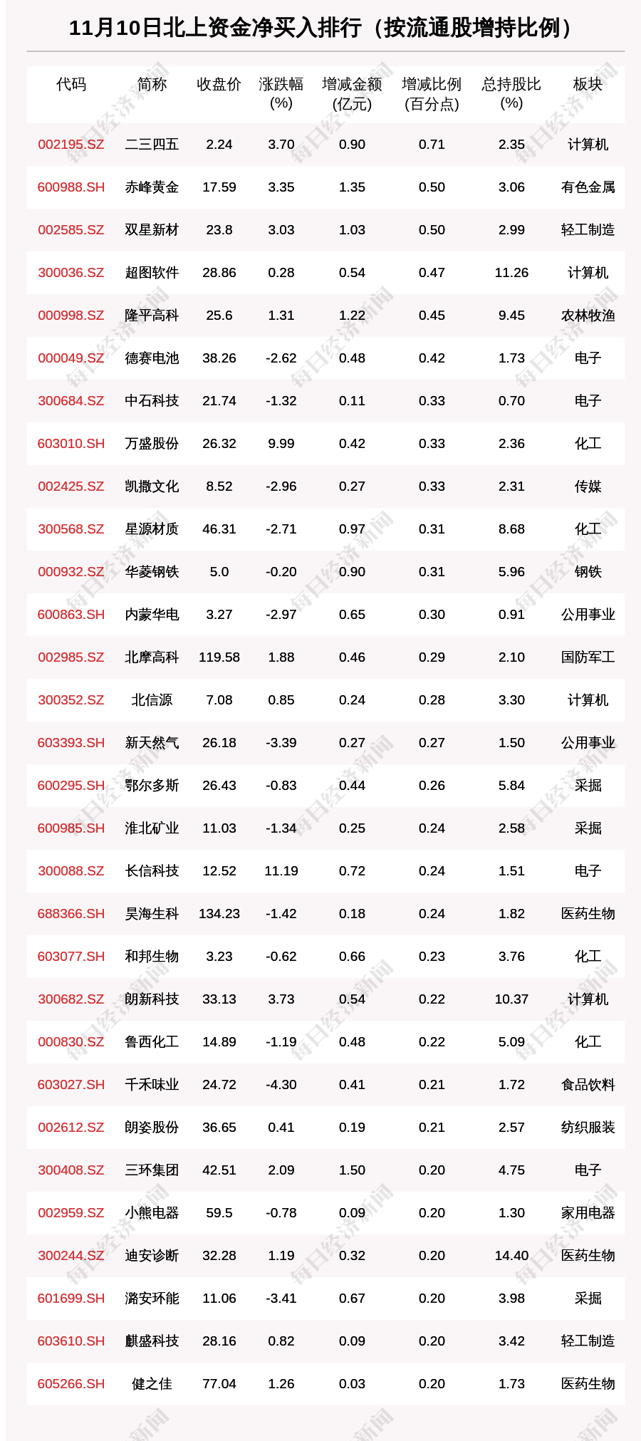 每经AI快讯,11月10日,北上资金净买入的个股共有556只,北上资金加仓比例超1%的有424只。其中,二三四五(002195.SZ,收盘价:2.24元)加仓比例最为明显,最新持股比例2.35%,环比增加0.71个百分点。其他北上资金加仓比例较多的个股还包括赤峰黄金(600988.SH,收盘价:17.59元)、双星新材(002585.SZ,收盘价:23.8元)、超图软件(300036.SZ,收盘价:28.86元)。