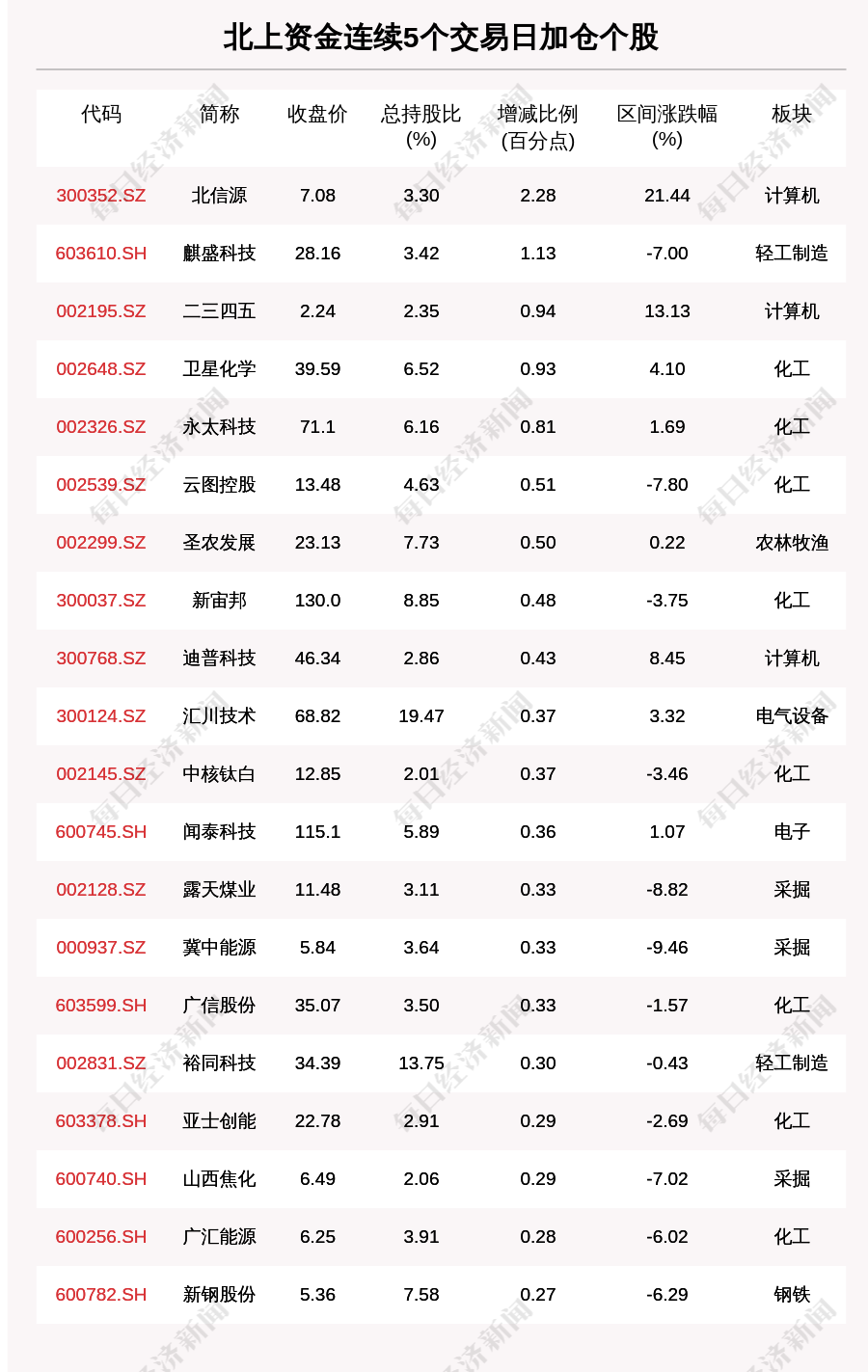 每经AI快讯,11月10日,北上资金连续5个交易日买入63个股。北上资金连续5个交易日加仓个股中,北信源(300352.SZ,收盘价:7.08元)增持比例增幅最大,5个交易日增持2.28个百分点,其他增持比例较大的个股包括麒盛科技(603610.SH,收盘价:28.16元)、二三四五(002195.SZ,收盘价:2.24元)、卫星化学(002648.SZ,收盘价:39.59元),分别增持1.13个百分点、0.94个百分点、0.93个百分点。