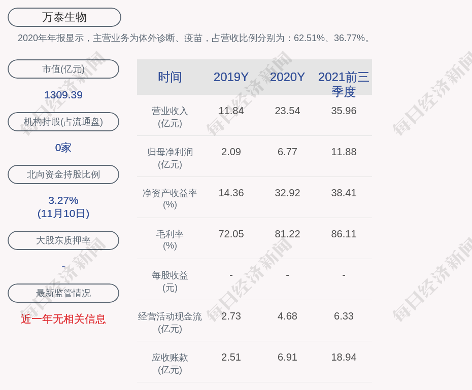 2020年年报显示,万泰生物的主营业务为体外诊断、疫苗,占营收比例分别为:62.51%、36.77%。