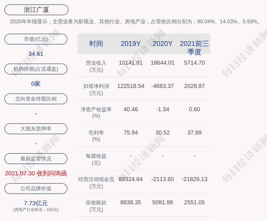 2020年年报显示,浙江广厦的主营业务为影视业、其他行业、房地产业,占营收比例分别为:80.04%、14.03%、5.93%。