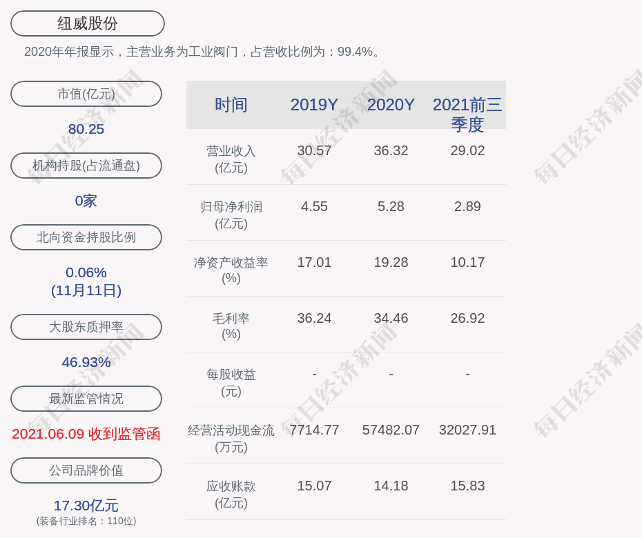 2020年年报显示,纽威股份的主营业务为工业阀门,占营收比例为:99.4%。