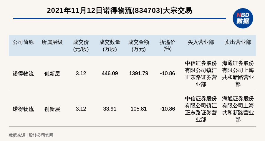 每经讯,2021年11月12日,新三板创新层公司诺得物流(834703)发生2笔大宗交易,总成交金额为1497.60万元,成交金额最高的一笔成交价3.12元/股,成交数量446.09万股,成交金额1391.79万元,折价10.86%。买入营业部是中信证券股份有限公司镇江正东路证券营业部,卖出营业部是海通证券股份有限公司上海共和新路营业部。
