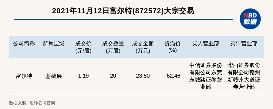 每经讯,2021年11月12日,新三板基础层公司富尔特(872572)发生一笔大宗交易,成交价1.19元/股,成交数量20万股,成交金额23.80万元,折价62.46%。买入营业部是中信证券股份有限公司东莞东城路证券营业部,卖出营业部是华西证券股份有限公司赣州新赣州大道证券营业部。