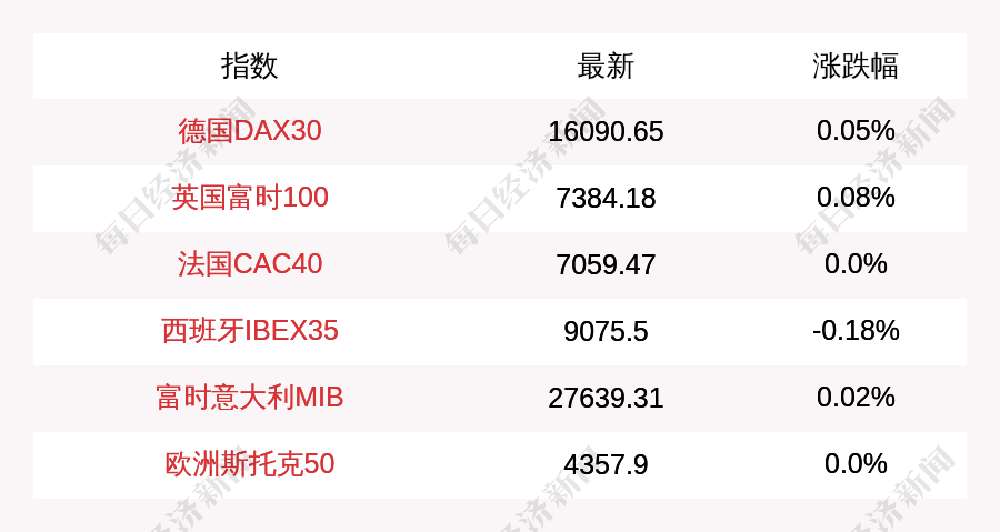 每经AI快讯:北京时间11月12日16:00,德国DAX30指数开盘上涨7.54点,涨幅为0.05%,报16090.65点;英国富时100指数开盘上涨5.57点,涨幅为0.08%,报7389.75点;法国CAC40指数平开,报7059.47点;西班牙IBEX35指数开盘下跌16.7点,跌幅为0.18%,报9075.5点;富时意大利MIB指数开盘上涨6.11点,涨幅为0.02%,报27639.31点;欧洲斯托克50指数平开,报4357.9点。