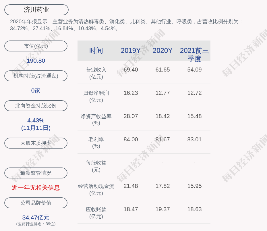 2020年年报显示,济川药业的主营业务为清热解毒类、消化类、儿科类、其他行业、呼吸类,占营收比例分别为:34.72%、27.41%、16.84%、10.43%、4.54%。
