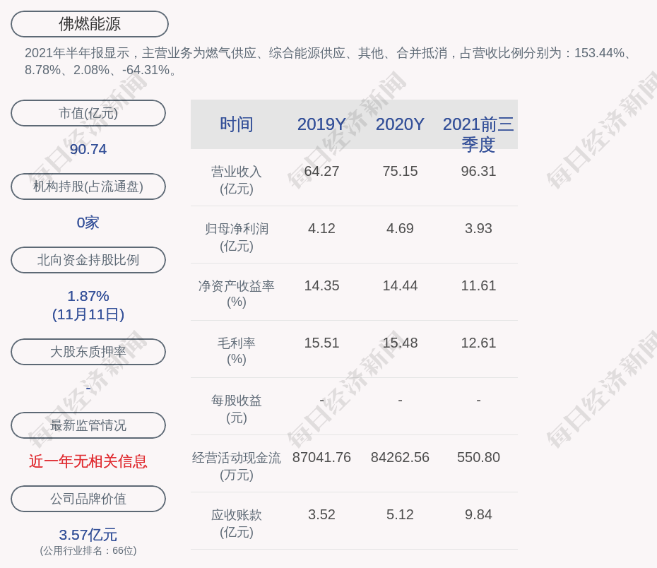 2021年半年报显示,佛燃能源的主营业务为燃气供应、综合能源供应、其他、合并抵消,占营收比例分别为:153.44%、8.78%、2.08%、-64.31%。