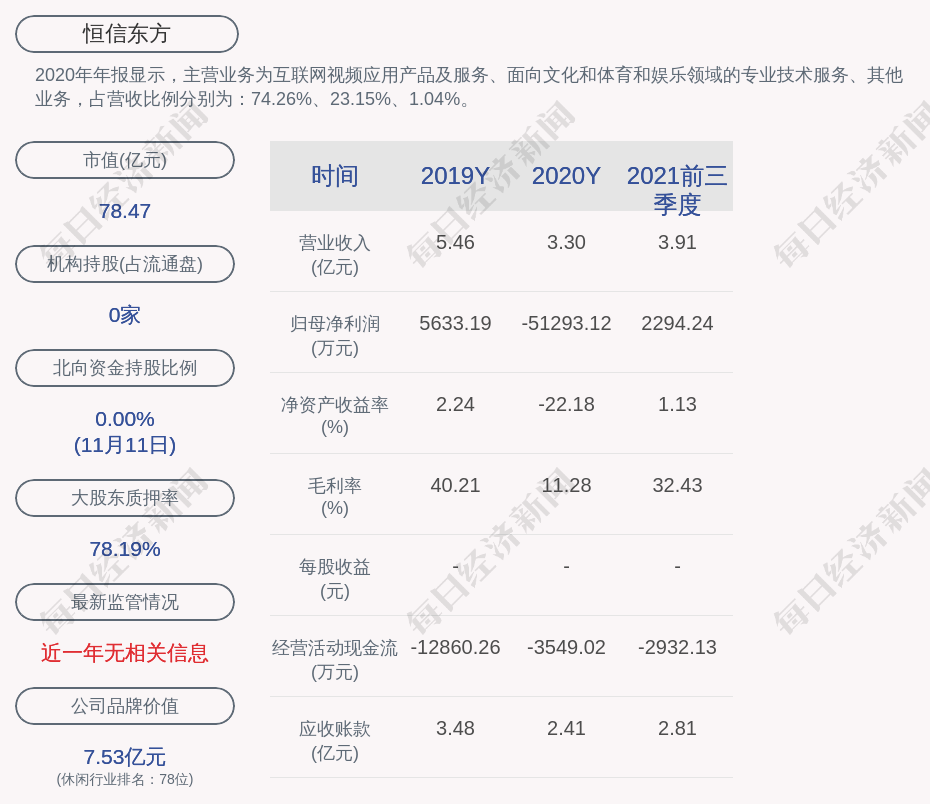 2020年年报显示,恒信东方的主营业务为互联网视频应用产品及服务、面向文化和体育和娱乐领域的专业技术服务、其他业务,占营收比例分别为:74.26%、23.15%、1.04%。