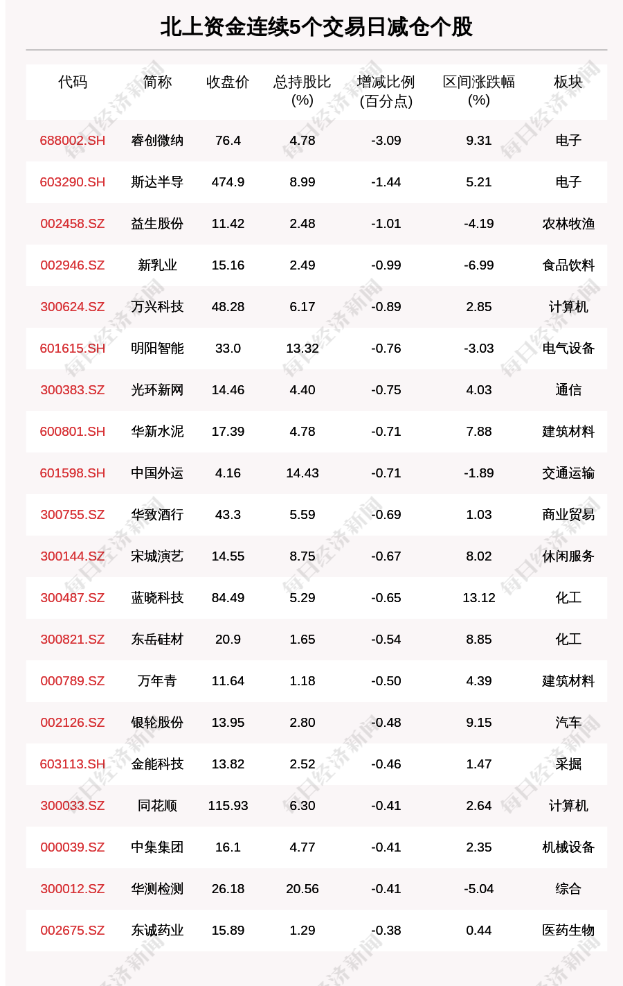 每经AI快讯,11月12日,北上资金连续5个交易日卖出62个股。北上资金连续5个交易日减仓个股中,睿创微纳(688002.SH,收盘价:76.4元)减持比例增幅最大,5个交易日减持3.09百分点,其他跌幅较大的个股包括斯达半导(603290.SH,收盘价:474.9元)、益生股份(002458.SZ,收盘价:11.42元)、新乳业(002946.SZ,收盘价:15.16元),分别减持1.44个百分点、1.01个百分点、0.99个百分点。