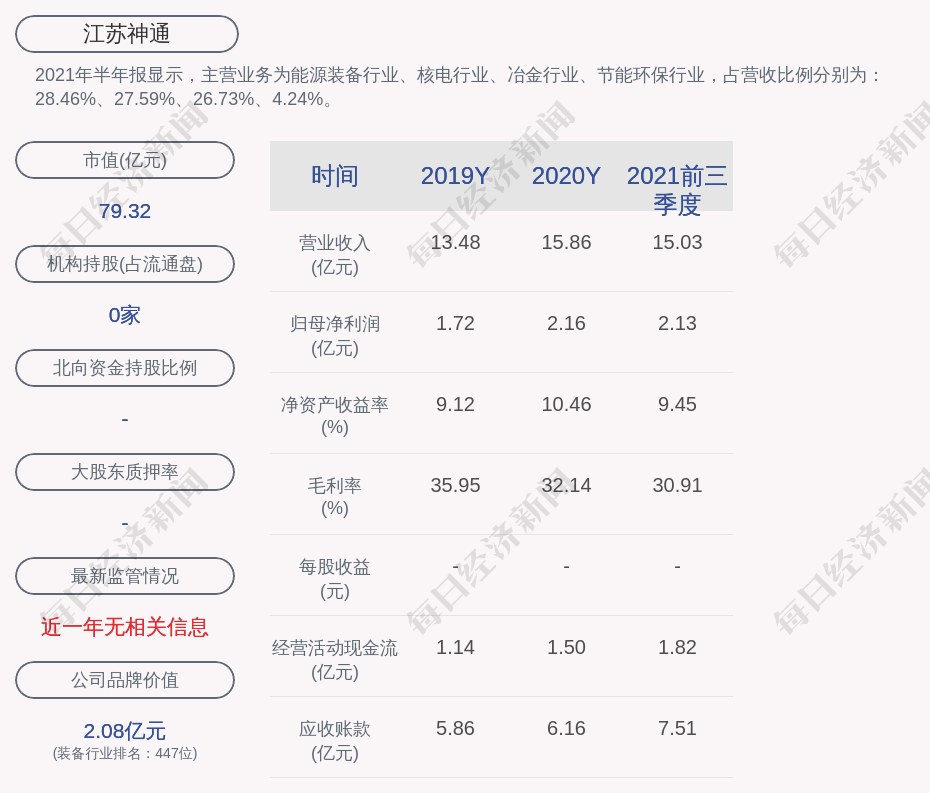 2021年半年报显示,江苏神通的主营业务为能源装备行业、核电行业、冶金行业、节能环保行业,占营收比例分别为:28.46%、27.59%、26.73%、4.24%。