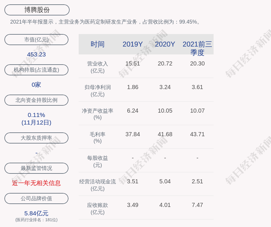 2021年半年报显示,博腾股份的主营业务为医药定制研发生产业务,占营收比例为:99.45%。