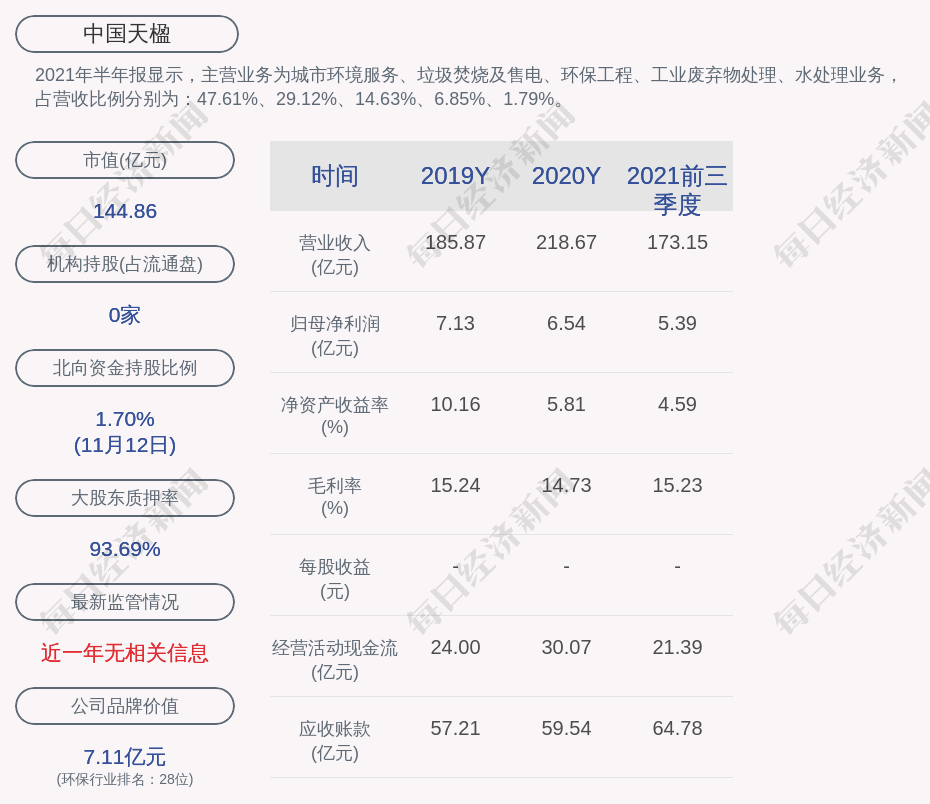 2021年半年报显示,中国天楹的主营业务为城市环境服务、垃圾焚烧及售电、环保工程、工业废弃物处理、水处理业务,占营收比例分别为:47.61%、29.12%、14.63%、6.85%、1.79%。