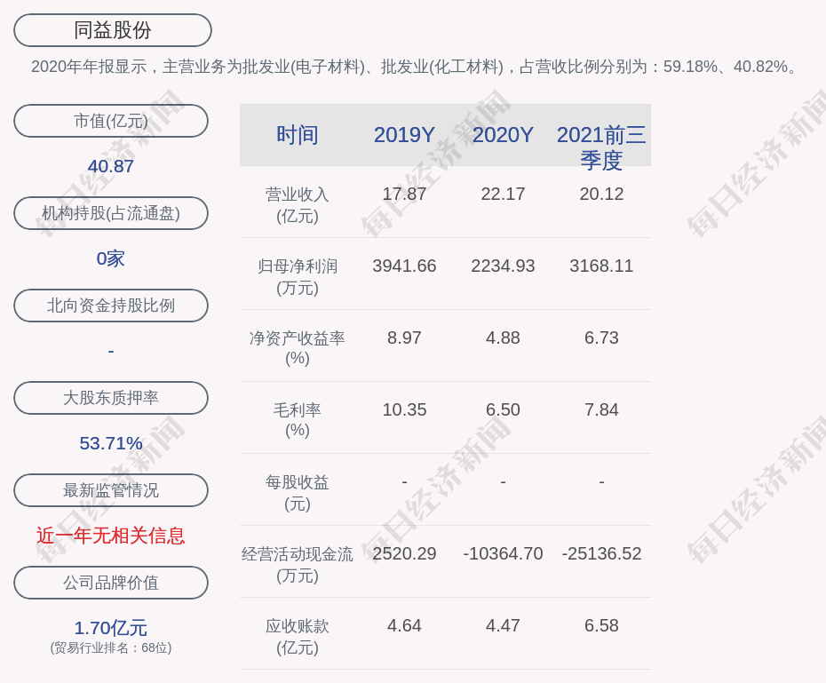 2020年年报显示,同益股份的主营业务为批发业(电子材料)、批发业(化工材料),占营收比例分别为:59.18%、40.82%。