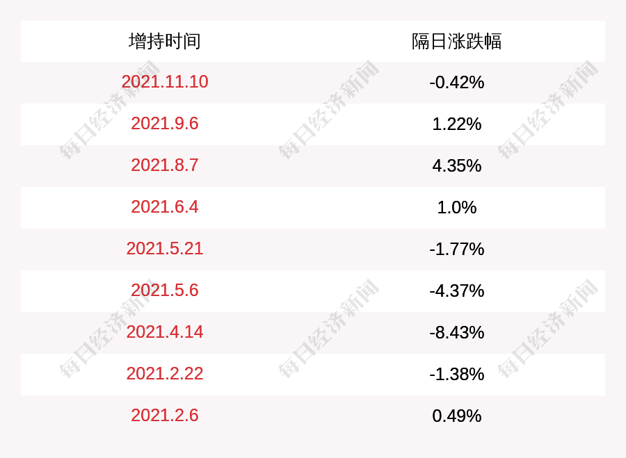3. 康弘药业上次发布增持公告是2021年11月10日,第二个交易日下跌0.42%,康弘药业近一年共发布10次增持类公告。更多关键信息,请搜索“道达号”。