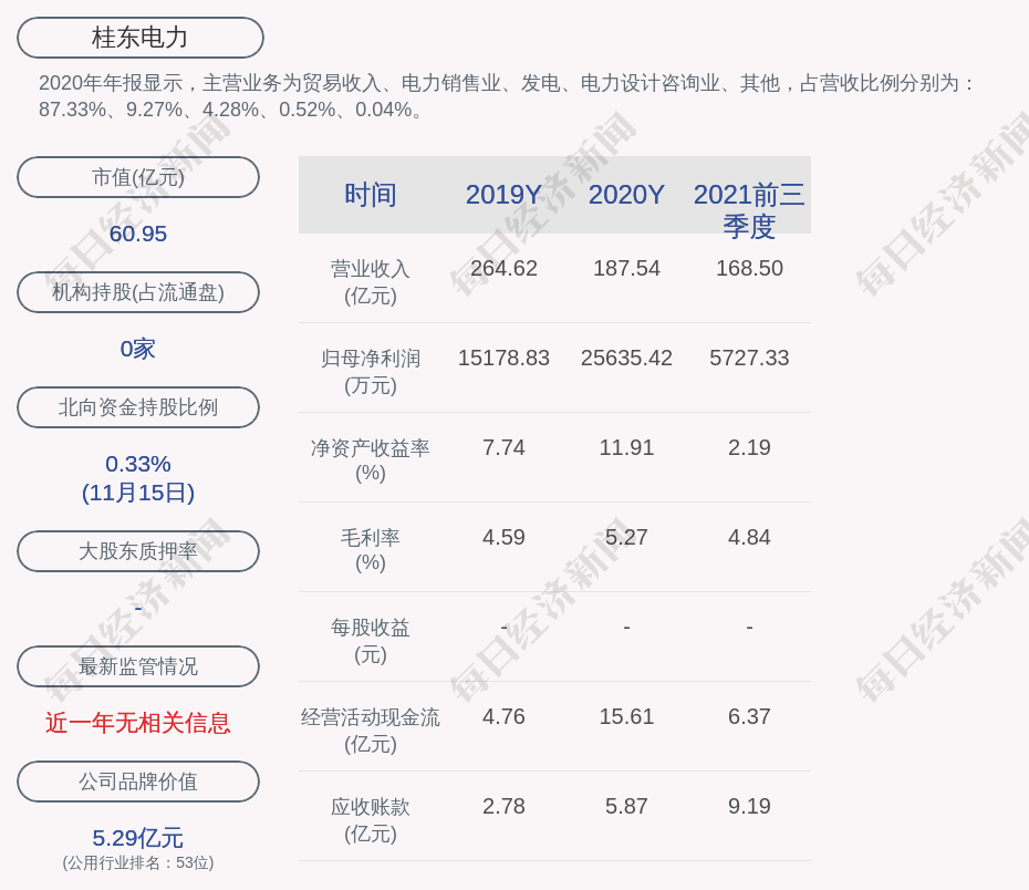2020年年报显示,桂东电力的主营业务为贸易收入、电力销售业、发电、电力设计咨询业、其他,占营收比例分别为:87.33%、9.27%、4.28%、0.52%、0.04%。