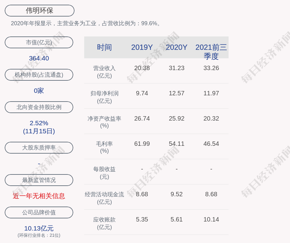 2020年年报显示,伟明环保的主营业务为工业,占营收比例为:99.6%。
