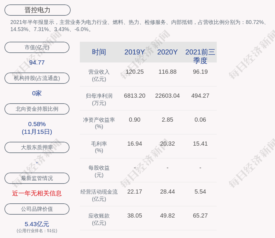 2021年半年报显示,晋控电力的主营业务为电力行业、燃料、热力、检修服务、内部抵销,占营收比例分别为:80.72%、14.53%、7.31%、3.43%、-6.0%。