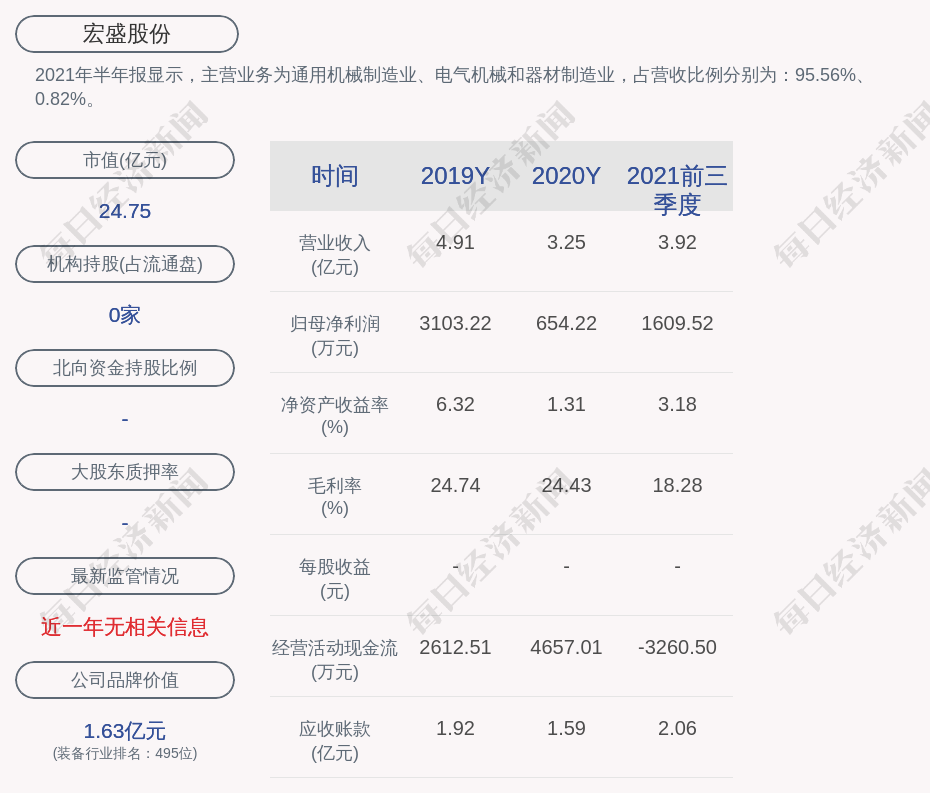 2021年半年报显示,宏盛股份的主营业务为通用机械制造业、电气机械和器材制造业,占营收比例分别为:95.56%、0.82%。