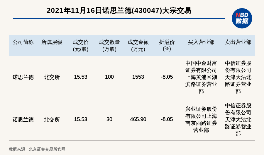 每经讯,2021年11月16日,北交所诺思兰德(430047)发生2笔大宗交易,折价率最高的一笔成交价15.53元/股,成交数量100万股,成交金额1553万元,折价8.05%。买入营业部是中国中金财富证券有限公司上海黄浦区湖滨路证券营业部,卖出营业部是中信证券股份有限公司天津大沽北路证券营业部。
