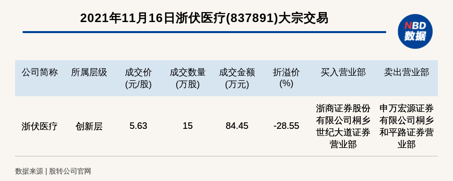 每经讯,2021年11月16日,新三板创新层公司浙伏医疗(837891)发生一笔大宗交易,成交价5.63元/股,成交数量15万股,成交金额84.45万元,折价28.55%。买入营业部是浙商证券股份有限公司桐乡世纪大道证券营业部,卖出营业部是申万宏源证券有限公司桐乡和平路证券营业部。