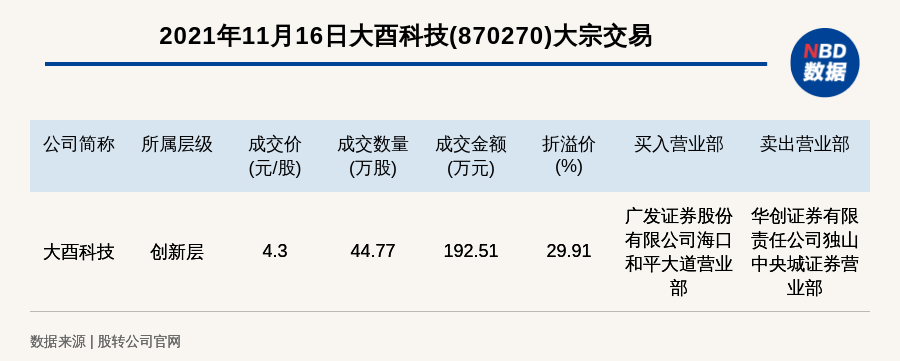 每经讯,2021年11月16日,新三板创新层公司大酉科技(870270)发生一笔大宗交易,成交价4.3元/股,成交数量44.77万股,成交金额192.51万元,溢价29.91%。买入营业部是广发证券股份有限公司海口和平大道营业部,卖出营业部是华创证券有限责任公司独山中央城证券营业部。