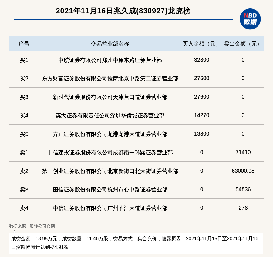 每经讯,2021年11月16日,兆久成(830927)登上龙虎榜,交易方式是集合竞价,披露原因是2021年11月15日至2021年11月16日涨跌幅累计达到-74.91%,成交数量11.46万股,成交金额18.95万元。买一席位为中航证券有限公司郑州中原东路证券营业部,买入3.23万元;卖一席位为中信建投证券股份有限公司成都南一环路证券营业部,卖出7.14万元。