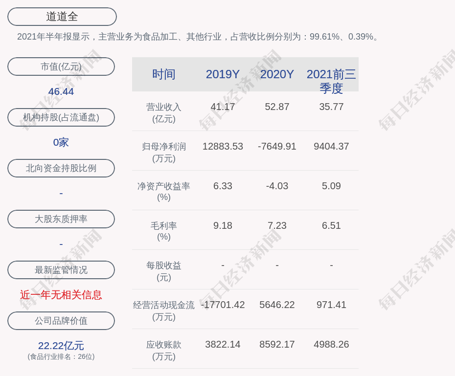 2021年半年报显示,道道全的主营业务为食品加工、其他行业,占营收比例分别为:99.61%、0.39%。