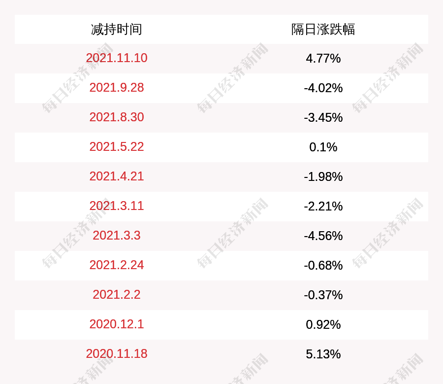 2. 金莱特上次发布减持公告是2021年11月10日,第二个交易日上涨4.77%,金莱特近一年共发布12次减持类公告。更多关键信息,请搜索“道达号”。