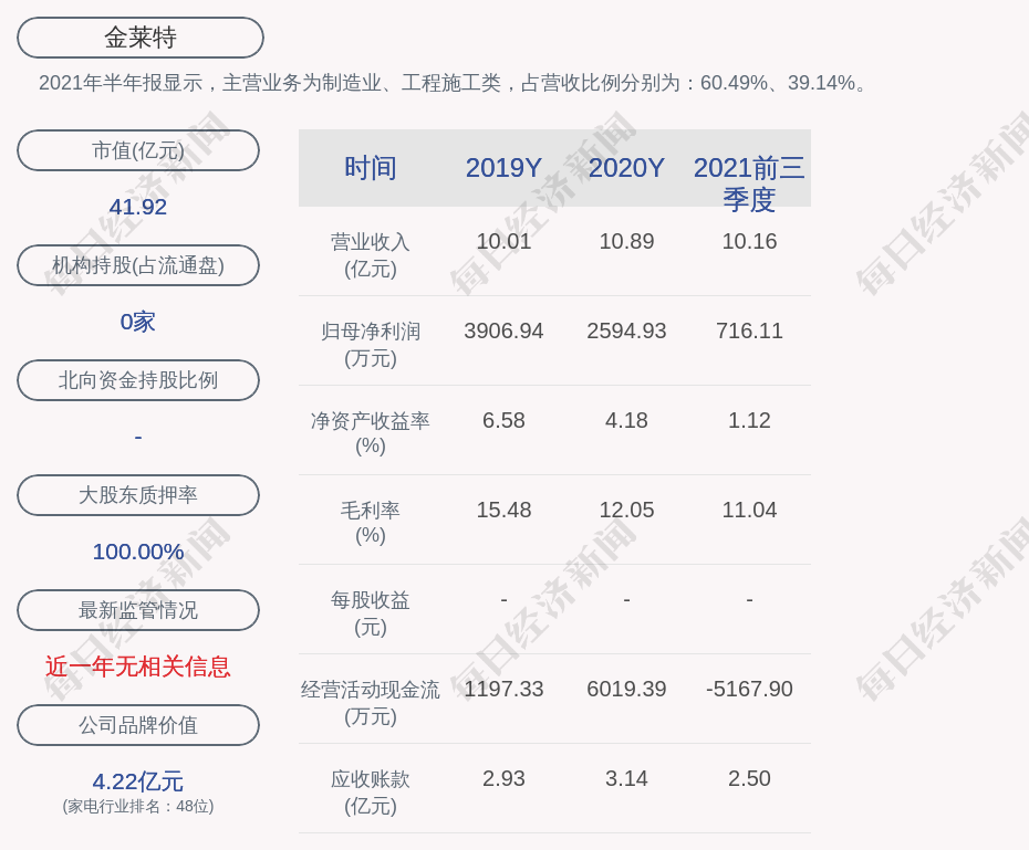 2021年半年报显示,金莱特的主营业务为制造业、工程施工类,占营收比例分别为:60.49%、39.14%。