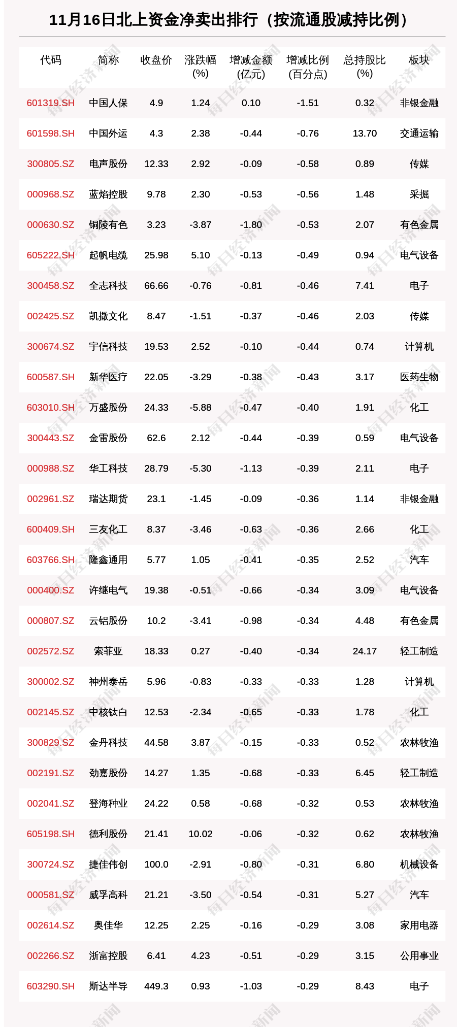 每经AI快讯,11月16日,北上资金净卖出的个股共有732只,北上资金减仓比例超1%的有584只。其中,中国人保(601319.SH,收盘价:4.9元)减仓比例最为明显,最新持股比例0.32%,环比减少1.51个百分点。其他北上资金减仓比例较多的个股还包括中国外运(601598.SH,收盘价:4.3元)、电声股份(300805.SZ,收盘价:12.33元)、蓝焰控股(000968.SZ,收盘价:9.78元)。