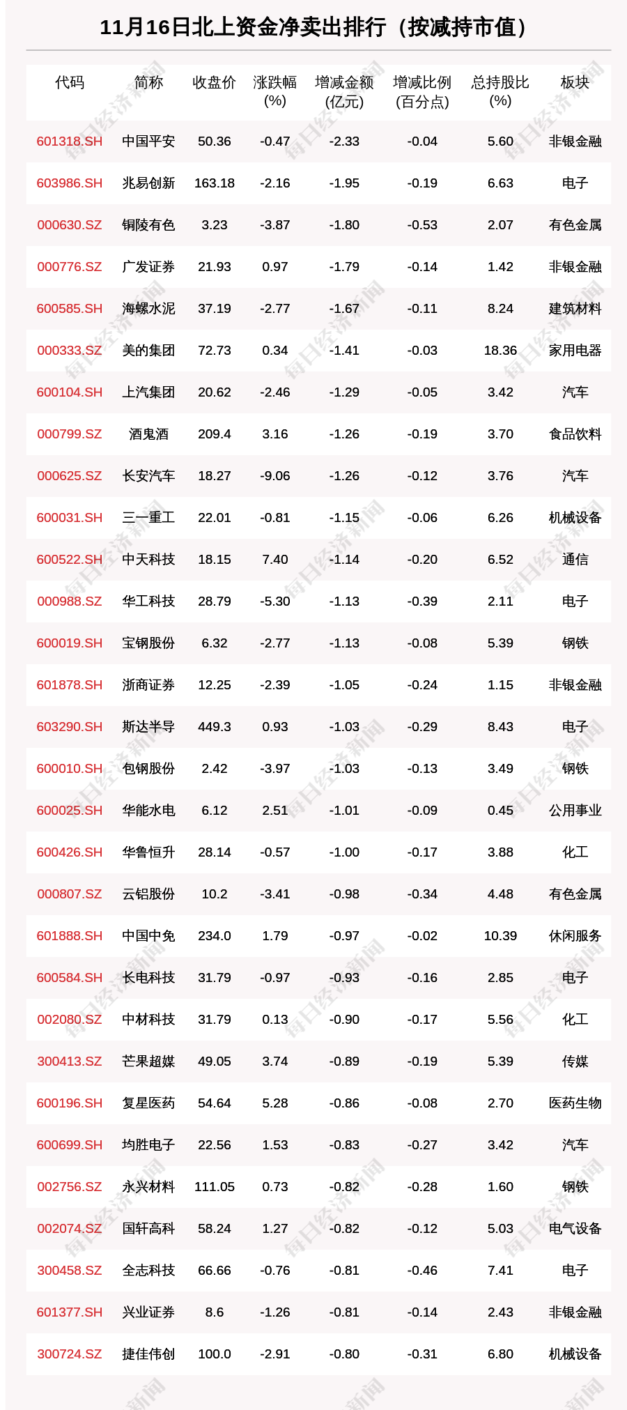11月16日,按照北向资金减持市值排序,中国平安(601318.SH,收盘价:50.36元)减持市值最大,减持市值2.332亿元,环比减少0.75%。其他北上资金减持市值较多的个股还包括兆易创新(603986.SH,收盘价:163.18元)、铜陵有色(000630.SZ,收盘价:3.23元)、广发证券(000776.SZ,收盘价:21.93元)。