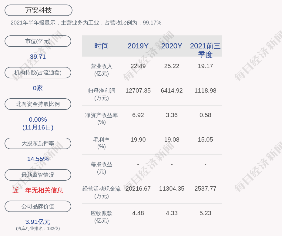 2021年半年报显示,万安科技的主营业务为工业,占营收比例为:99.17%。