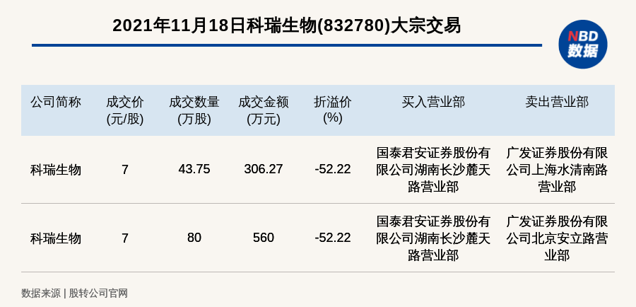 每经讯,2021年11月18日,新三板创新层公司科瑞生物(832780)发生2笔大宗交易,其中一笔成交价7元/股,成交数量43.75万股,成交金额306.27万元,折价52.22%。买入营业部是国泰君安证券股份有限公司湖南长沙麓天路营业部,卖出营业部是广发证券股份有限公司上海水清南路营业部。