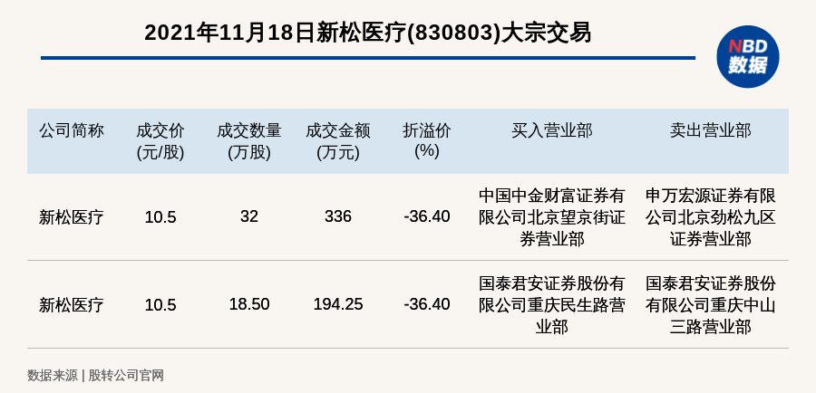 每经讯,2021年11月18日,新三板基础层公司新松医疗(830803)发生2笔大宗交易,其中一笔成交价10.5元/股,成交数量32万股,成交金额336万元,折价36.4%。买入营业部是中国中金财富证券有限公司北京望京街证券营业部,卖出营业部是申万宏源证券有限公司北京劲松九区证券营业部。