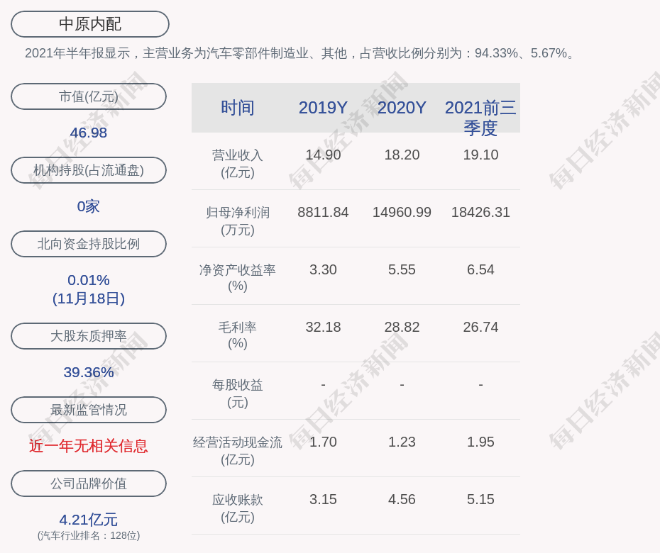2021年半年报显示,中原内配的主营业务为汽车零部件制造业、其他,占营收比例分别为:94.33%、5.67%。