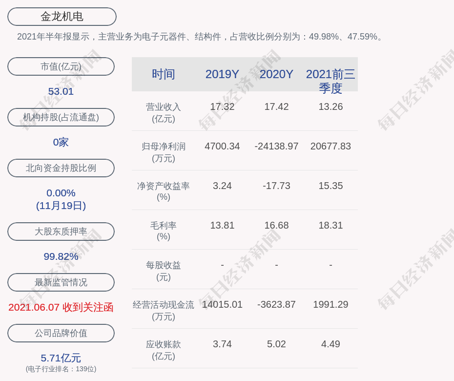 2021年半年报显示,金龙机电的主营业务为电子元器件、结构件,占营收比例分别为:49.98%、47.59%。