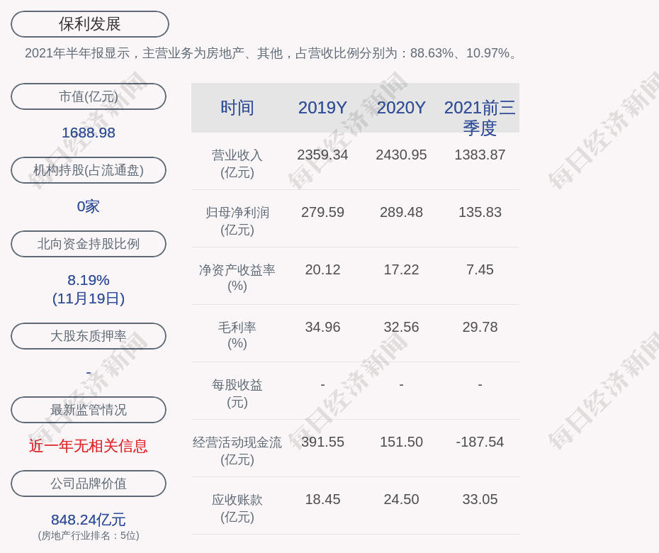 2021年半年报显示,保利发展的主营业务为房地产、其他,占营收比例分别为:88.63%、10.97%。